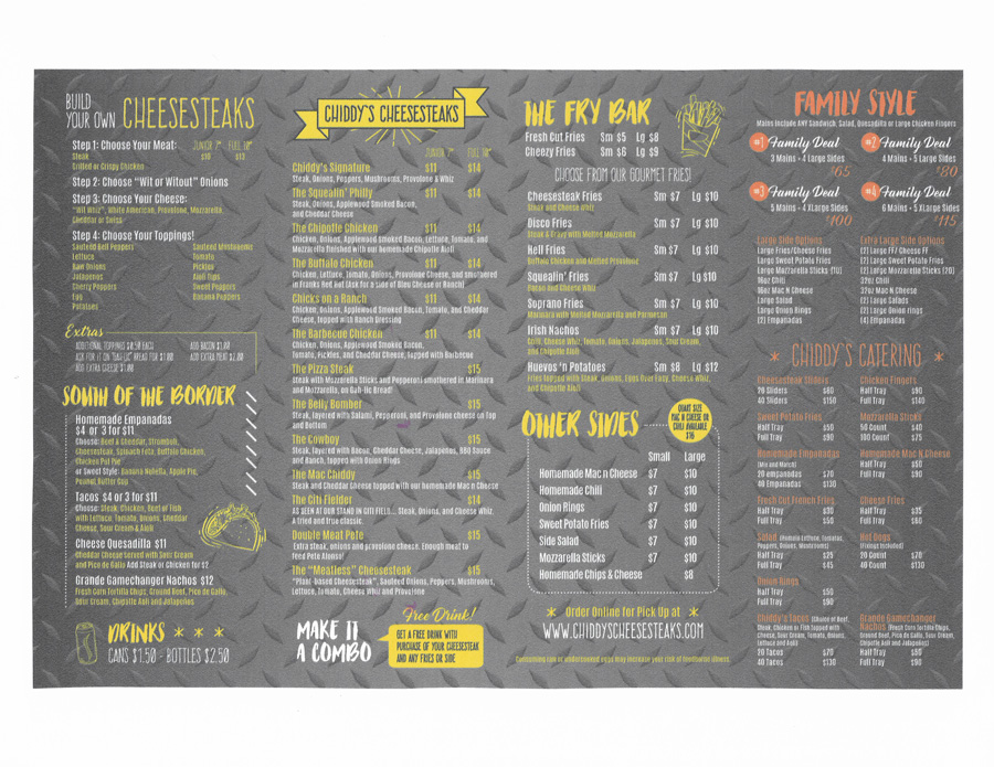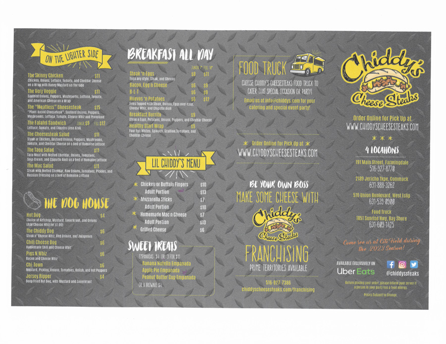 From our delicious empanadas, all types of appetizers, and of course our absolutely incredible Chiddy’s Cheese Steaks which are the best in Deer Park, NY. Just check out our menu below.